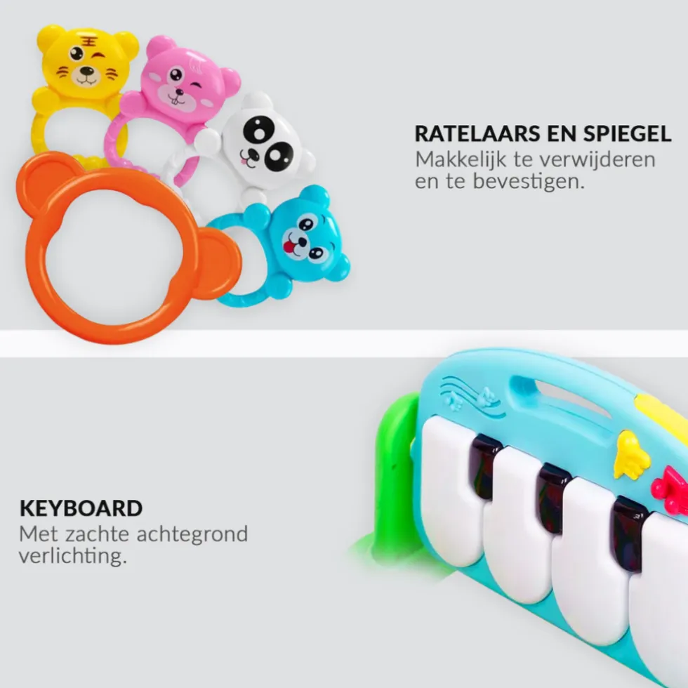 Je kunt het in delen uit elkaar halen en apart gebruiken. Zo kan je de rammelaars en piano loskoppelen en aan een wieg of kinderwagen hangen. De kleine kan zich dus overal bezig houden. muzikale talenten kan ontplooien. Ook kan de indeling gewijzigd worden. De 3-in-1 functie van de speelmat geeft jouw prins of prinses de mogelijkheid de wereld te ontdekken hoe hij of zij dat maar wilt! Liggend op het rugje, op de buik, of zittend bij de piano?