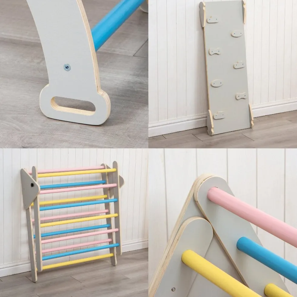 Maak kennis met de Buxibo Opvouwbare Driehoek + Klimboog + Helling, een veelzijdig stuk Montessori meubels houten speelgym dat binnen plezier en avontuur biedt voor kinderen. Dit speelgoed combineert een klimrek, glijbaan en klimboog, waardoor het perfect is voor actief spelen en ontdekken.
