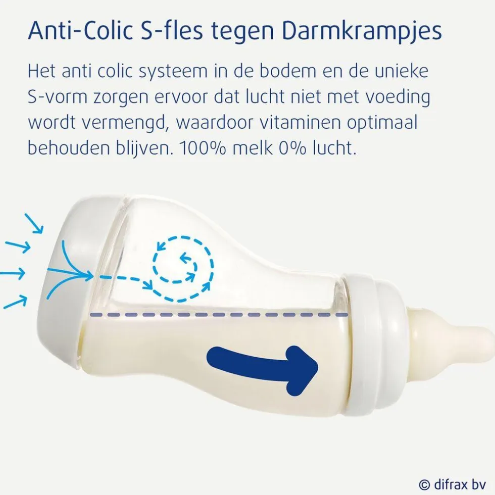 De constante luchttoevoer vanuit de bodem van de S-fles voorkomt vacuüm trekken, zodat je kindje probleemloos kan drinken. Tijdens flesvoeding zit je automatisch in de juiste houding. Zelfs als de fles bijna leeg is.