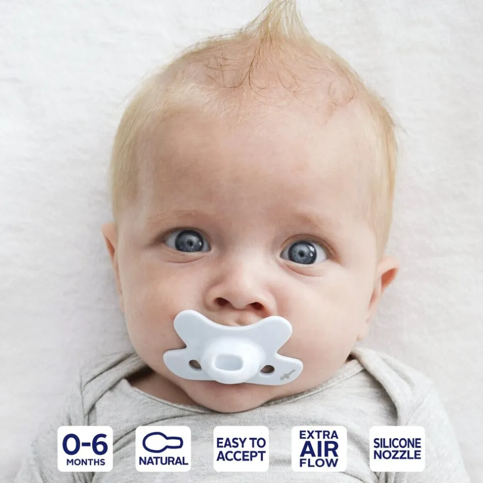 Difrax Pure Natural 0-6 maanden Fopspeen heeft een vlindervormig schildje, waardoor het neusje vrij blijft. Deze fopspeen is symmetrisch, wat je baby snel herkent en makkelijk(er) zal accepteren.
