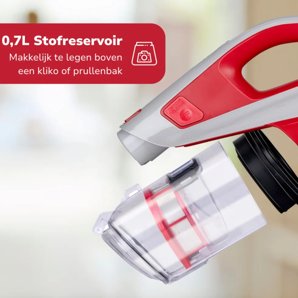 Naast draadloos is de Dirt Devil steelstofzuiger ook een stofzuiger zonder zak. Al het stof en vuil komt direct in de daarvoor bedoelde opvangbak terecht. Deze heeft een maximale capaciteit van 0.7 liter. Na gebruik maak je de opvangbak van de Dirt Devil stofzuiger makkelijk leeg boven een kliko of prullenbak. Door de afwezigheid van een zak kom je minder in aanraking met stof. Dit maakt de steelstofzuiger en kruimelzuiger van Dirt Devil uitermate geschikt voor mensen met allergiëen.