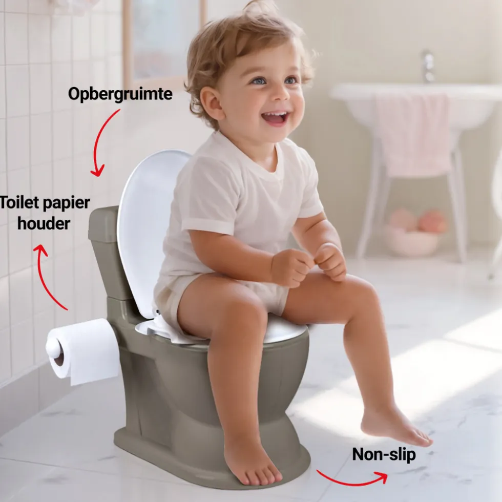 Begin de zindelijkheidstraining van jouw kleintje met de Potty XL van Dolu! Op deze manier kan jouw kind direct op een echt wc’tje beginnen. De Potty ziet er ook uit als een echt wc’tje. Het potje heeft namelijk een rolhouder en doortrekgeluiden. Het zal voor je kindje net lijken of hij naar de grote mensen wc gaat. De bodem van het potje is voorzien van anti-slip waardoor hij niet schuift over de vloer. De stortbak van de wc is voorzien van een opbergvak. Hierin kun je bijvoorbeeld vochtige doekjes opbergen. De uitneembare binnenkant is gemakkelijk te legen en schoon te maken.