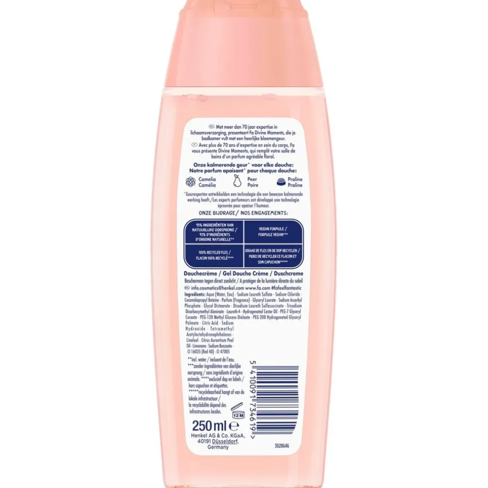 Ontdek Fa Divine Moments Douchecrème met de geur van wilde camelia. De vegan formule bevat 94% ingrediënten van natuurlijke oorsprong (inclusief water).