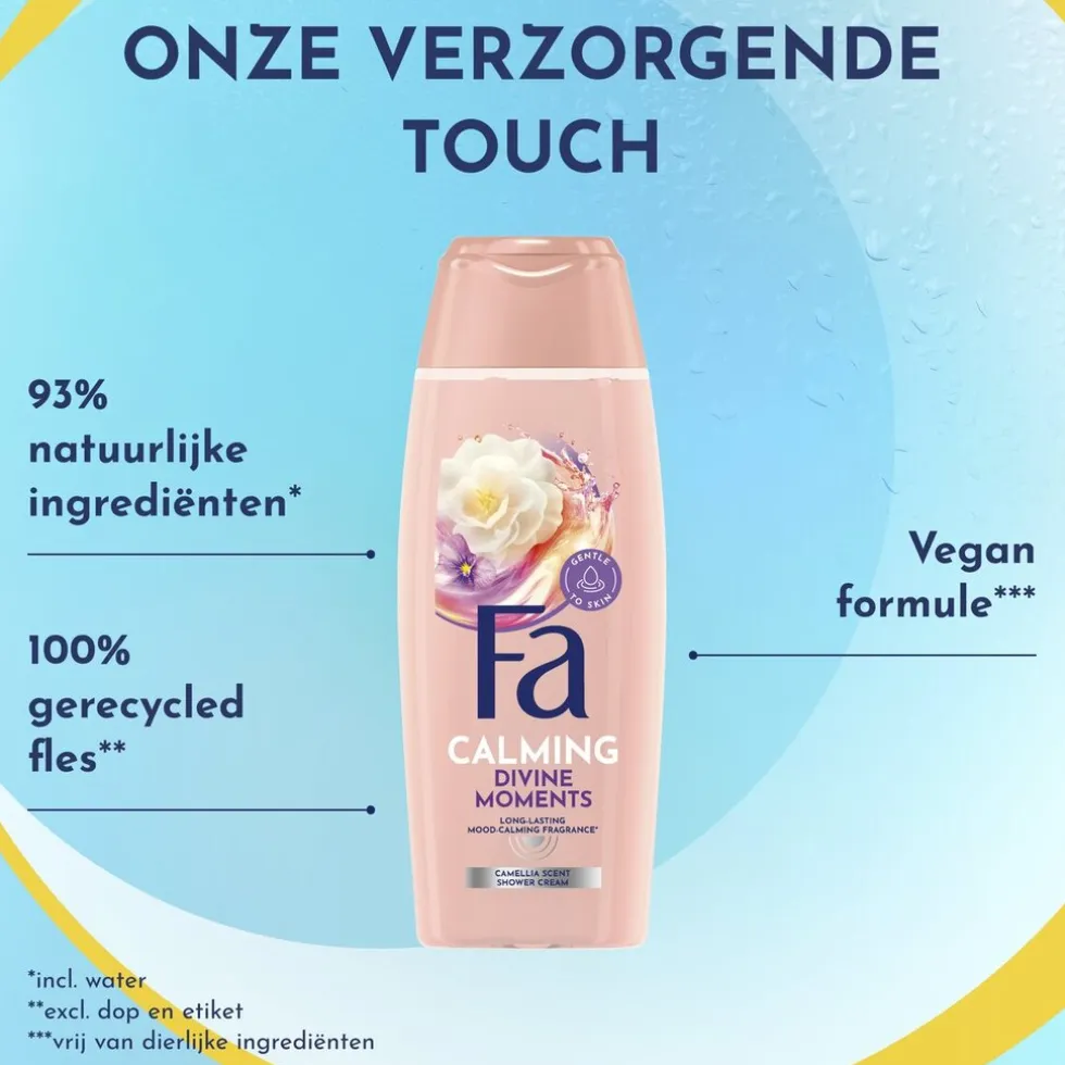 Deze Fa douchecrème bevat 93% ingrediënten van natuurlijke oorsprong.** De formule is veganistisch.*** Deze douchecrème is gemaakt met een 100% gerecyclede fles**** en een recyclebare fles en dop.*****