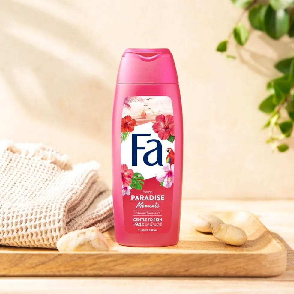 Ontdek Fa Paradise Moments Douchecrème met de geur van hibiscusbloem. De vegan formule bevat 94% ingrediënten van natuurlijke oorsprong (incl. water).