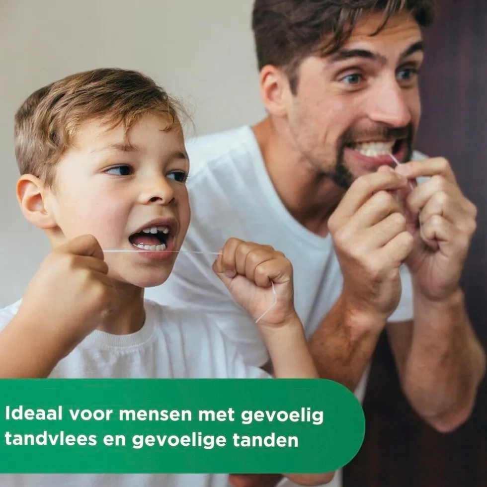 Het flossdraad is dun en gemakkelijk tussen je tanden en kiezen te krijgen. Zodra het ertussen zit, zet de floss uit. Hierdoor is het gemakkelijk in alle ruimtes tussen je tanden te passen en bereik je meer tandoppervlak.