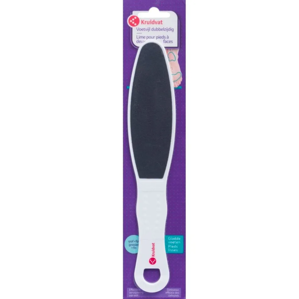 Verwijder verhardingen en eelt op je voeten met de Kruidvat Dubbelzijdige Voetvijl. De vijl heeft een grove en een fijne kant, waardoor je je voeten gericht verzorgt. Start altijd met de grove vijl en gebruik daarna de fijne.