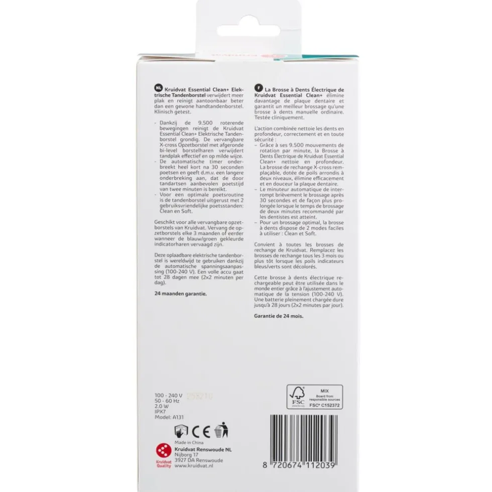 Bij Kruidvat zijn we actief bezig met duurzaamheid en zetten we al veel kleine stapjes. Ook onze Kruidvat Merk producten worden steeds een beetje duurzamer. Zo is de verpakking van deze Kruidvat elektrische tandenborstel plasticvrij gemaakt en daardoor goed recyclebaar. Op jaarbasis besparen we zo 2.000 kg plastic. Hiermee zetten we weer een stapje richting een duurzamere wereld!