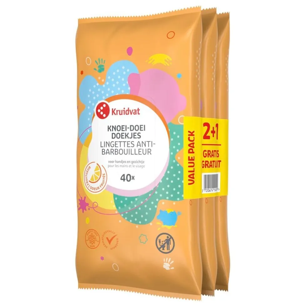 Kruidvat Knoei-Doei Doekjes maken handjes en gezichtjes snel weer hygiënisch schoon en fris. Ze hebben een frisse fruitgeur en zijn zacht voor je huid.