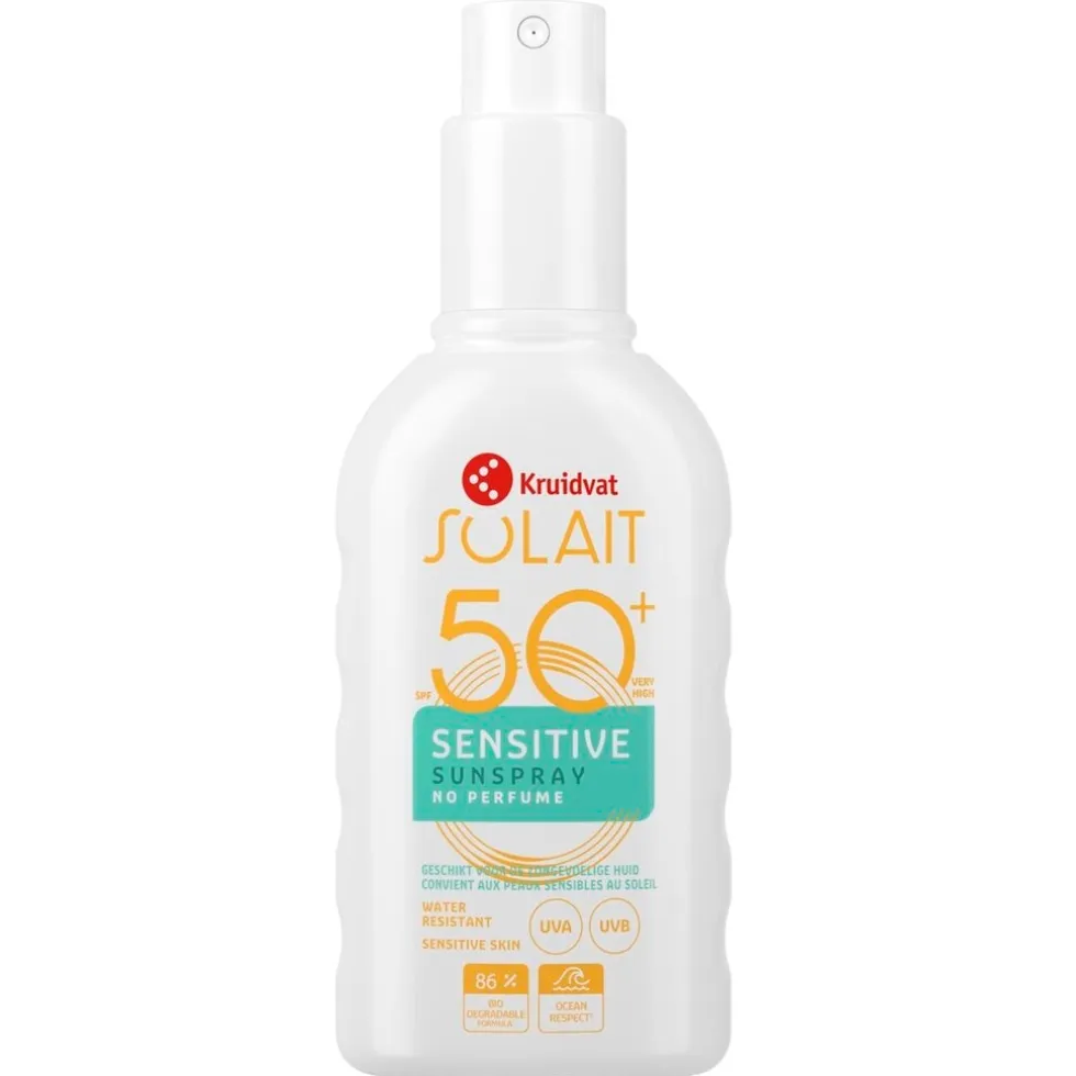Kruidvat Solait Sensitive SPF50+ Sunspray biedt zeer hoge bescherming voor je huid. De formule met vitamine E is speciaal ontwikkeld voor de gevoelige huid om het risico op reacties veroorzaakt door de zon te verminderen.