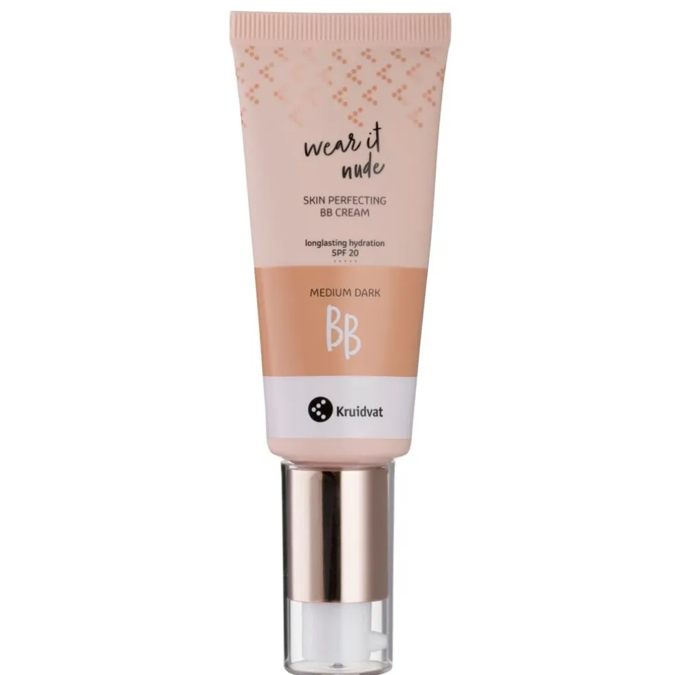 De langdurig hydraterende Kruidvat Wear It Nude Skin Perfecting Medium Dark BB Cream met getinte pigmenten past zich bij contact met je huid aan je teint aan. De crème heeft een lichte dekking voor een natuurlijke uitstraling.