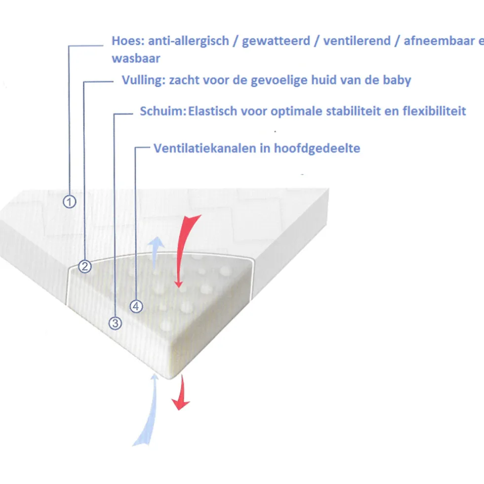 Het matras heeft een afneembare en wasbare hoes die anti-allergisch, gewatteerd en ventilerend is, De vulling bestaat uit elastisch schuim voor een optimale stabiliteit en flexibiliteit. Het matras beschikt verder over extra ventilatiekanalen om vochtvorming en het risico op verstikking te minimaliseren.