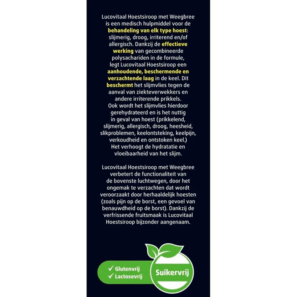 Suikervrij. Lucovitaal Hoestsiroop metWeegbree is een medisch hulpmiddel voor debehandeling van elk type hoest: slijmerig,droog, irriterend en/of allergisch. Dankzij deeffectieve werking van gecombineerdepolysachariden in de formule, legt LucovitaalHoestsiroop een aanhoudende,beschermende en verzachtende laag in dekeel. Dit beschermt het slijmvlies tegen deaanval van ziekteverwekkers en andereirriterende prikkels. Ook wordt het slijmvlieshierdoor gerehydrateerd en is het nuttig ingeval van hoest (prikkelend, slijmerig,allergisch, droog, heesheid, slikproblemen,keelontsteking, keelpijn, verkoudheid enontstoken keel.) Het verhoogt de hydratatie envloeibaarheid van het slijm. LucovitaalHoestsiroop met Weegbree verbetert defunctionaliteit van de bovenste luchtwegen,door het ongemak te verzachten dat wordtveroorzaakt door herhaaldelijk hoesten (zoals pijn op de borst, een gevoel van benauwdheidop de borst).