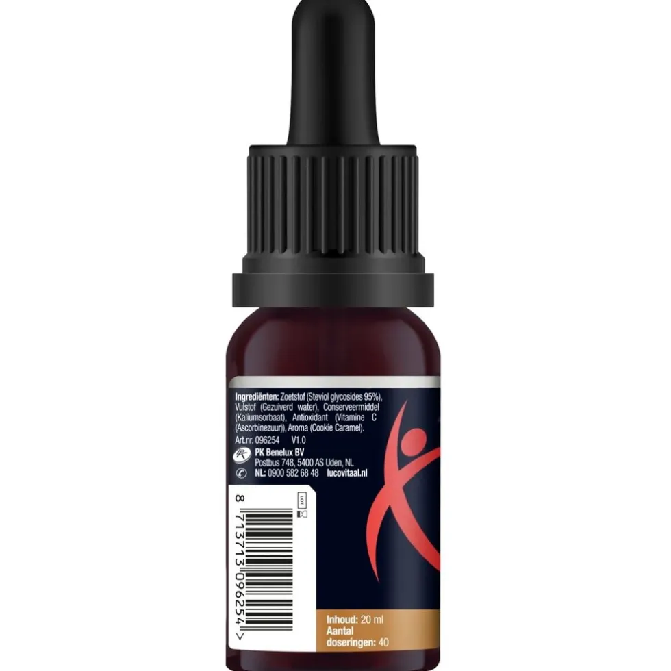 Ingrediënten: Zoetstof (Steviol glycosides 95%), Vulstof (Gezuiverd water), Conserveermiddel (Kaliumsorbaat), Antioxidant (Vitamine C (Ascorbinezuur)), Aroma (Cookie Caramel).