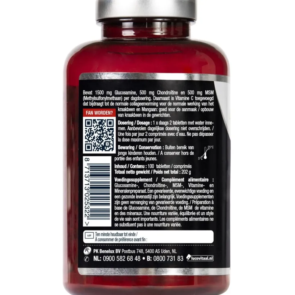 Lucovitaal Glucosamine Chondroïtine MSM Tabletten bevatten 1500 mg glucosamine, 500 mg chondroïtine en 500 mg MSM per dagdosering.