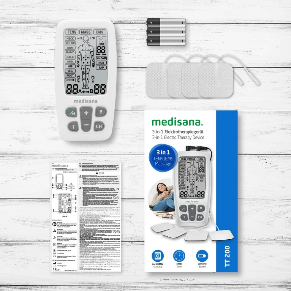 Het moderne 3-in-1 elektrotherapieapparaat TT 200 van medisana staat voor TENS, EMS en massage met verschillende programma’s. Het grote, duidelijke display zorgt voor een goede leesbaarheid tijdens de verschillende toepassingsmogelijkheden.