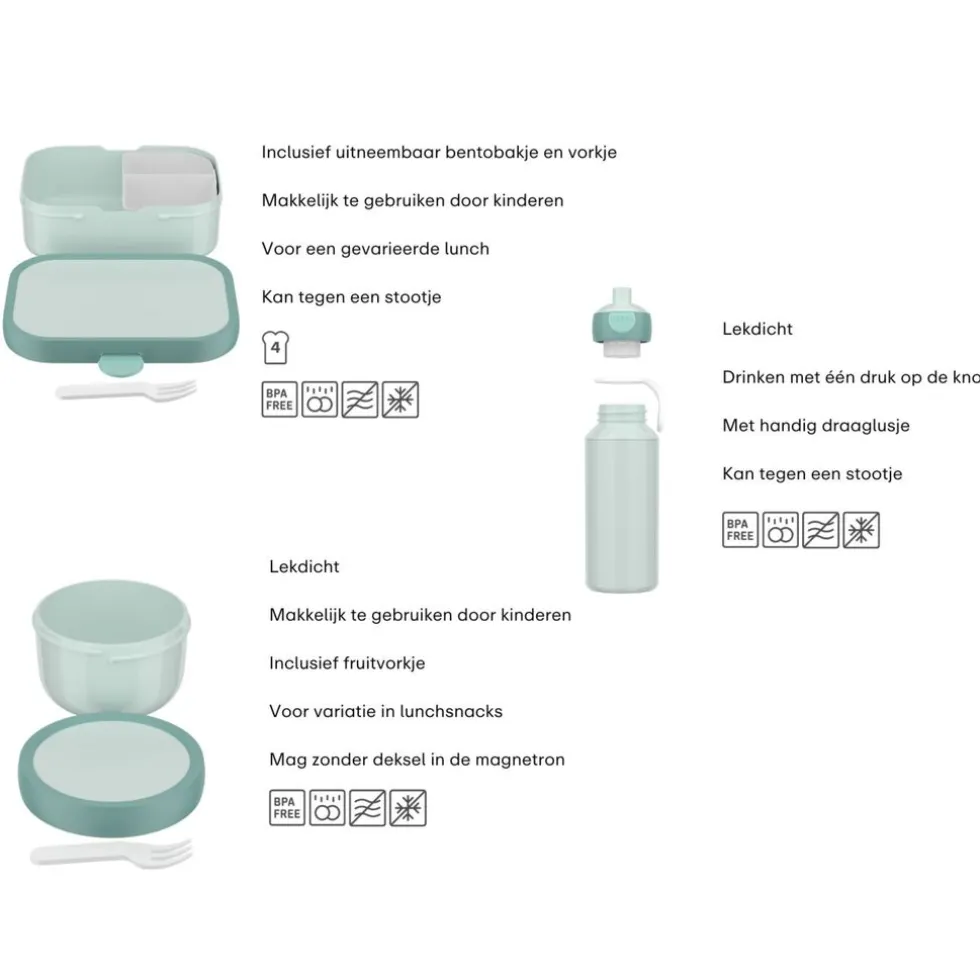 De Campus producten van Mepal zijn ideaal om mee te nemen naar school, in de speeltuin, op de crèche en tijdens een dagje uit. Een stoere broodtrommel met bento bakje voor je favoriete snacks. De drinkbekers sluiten lekvrij af en zijn ook door kinderhandjes makkelijk te openen. En de pop-up drinkfles, druk en drink, dat is het principe! De isoleerfles flip-up zorgt voor een koel drankje en een coole uitstraling op het schoolplein. En wil je een gezonde snack meenemen, kies dan voor de fruitbox met handig vorkje. De deksel sluit perfect af, maar is ook door kinderhandjes makkelijk te openen. Alle Mepal Campus producten zijn in diverse kleuren en prints te verkrijgen. Voor ieder kind een bijpassende lunchset mee naar school!