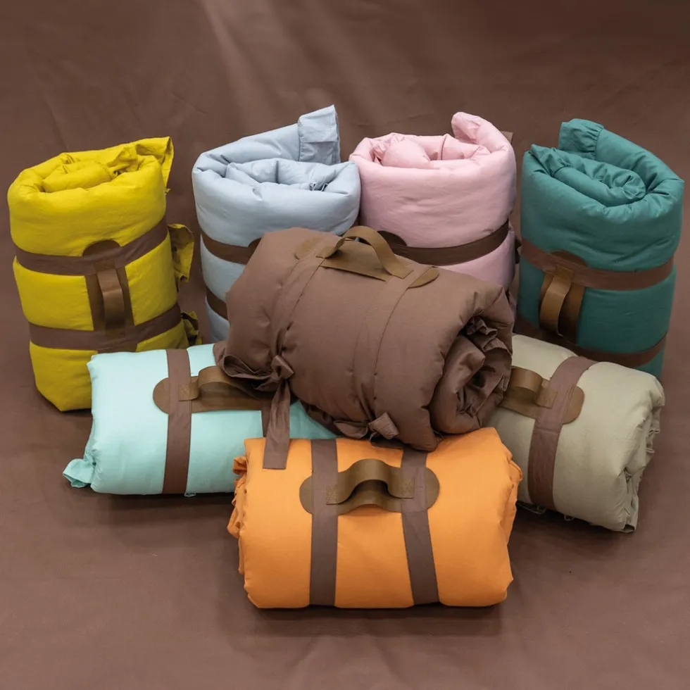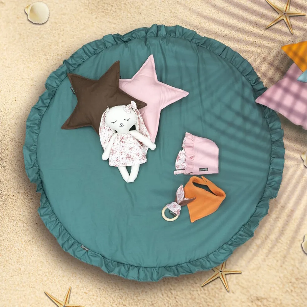 Op het ronde kleed kan je kindje leren rollen, kruipen en grijpen en hij is zowel binnen als buiten te gebruiken. Dankzij het leren handvat kan je het kleed gemakkelijk oprollen en overal mee naar toe nemen.