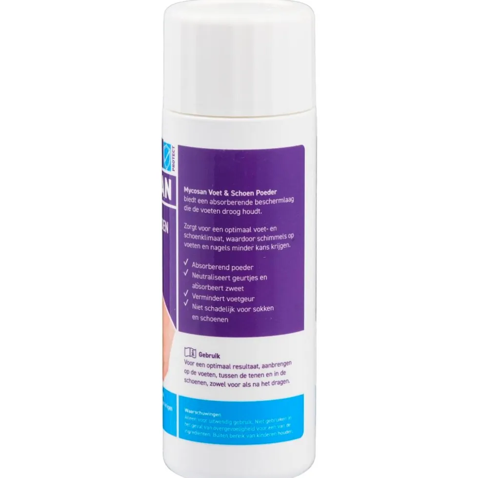 Mycosan Voet & Schoenpoeder deodoriseert je voeten en beschermt ze tegen schimmelinfecties. Het poeder houdt je voeten fris en droog en zorgt voor een optimaal voet- en schoenklimaat die de groei van schimmel remt.