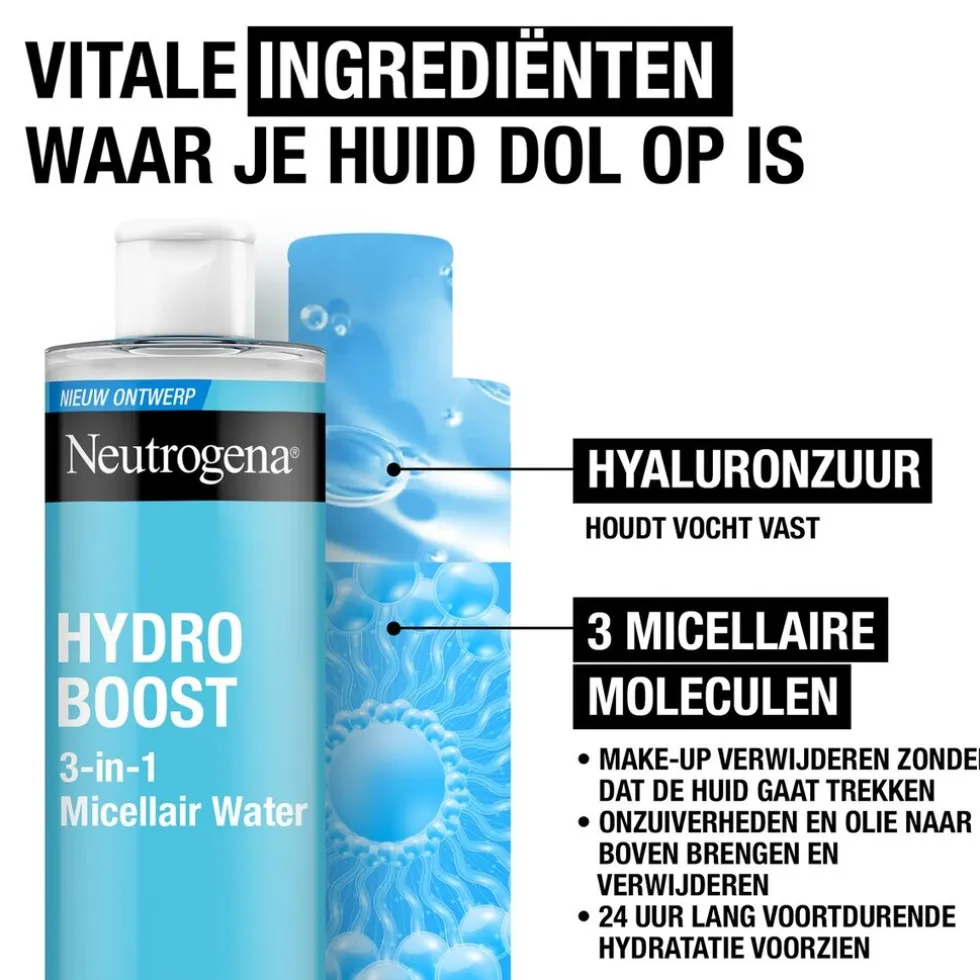 Het Neutrogena Hydro Boost 3-in-1 Micellair Water biedt een zachte en effectieve reiniging door make-up te verwijderen, zonder dat je huid gaat trekken.