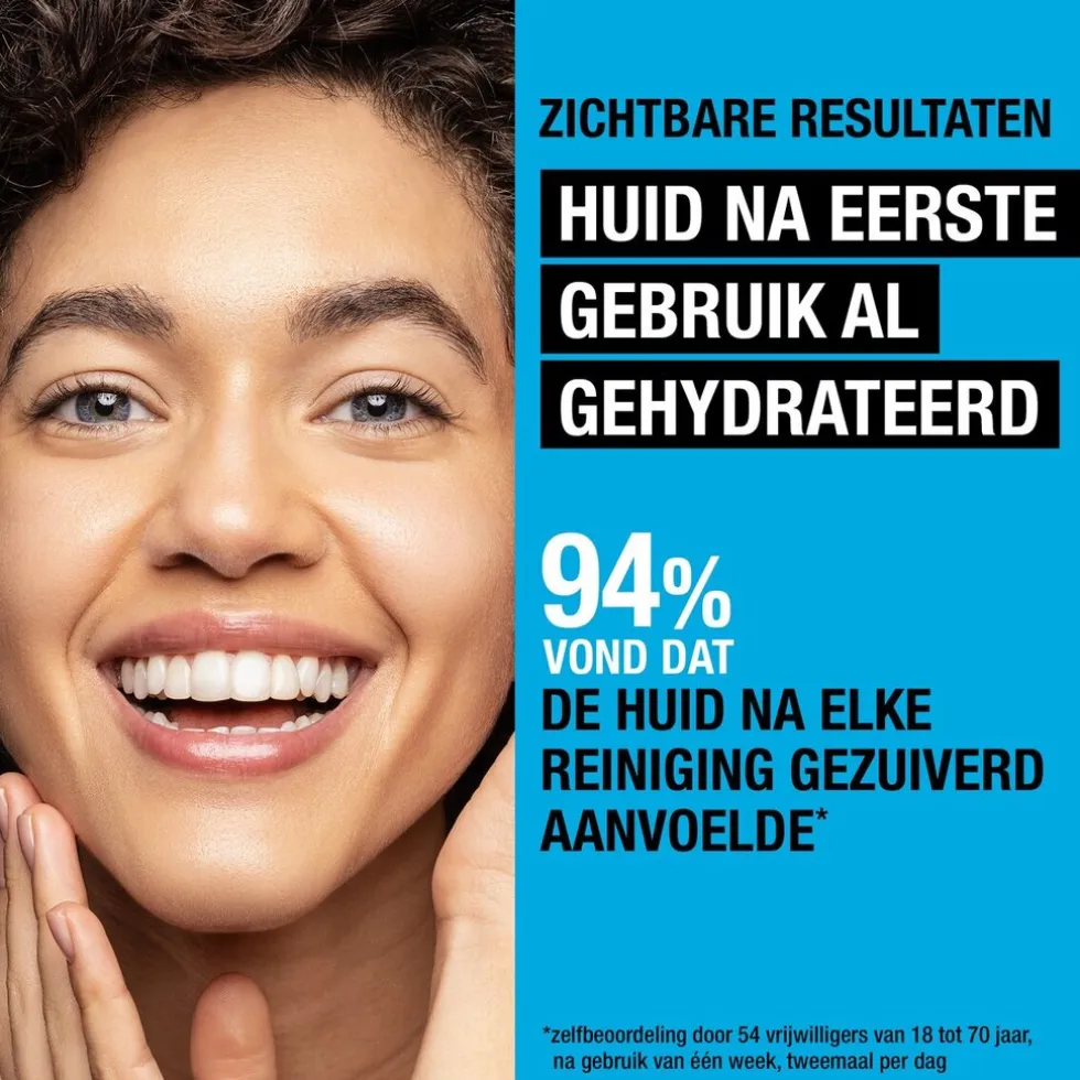 Het is wetenschappelijk bewezen dat je huid al na één keer gebruik meer gehydrateerd is. Na slechts één week gebruik geniet je van een gezond uitziende huid. 94% van de gebruikers vond dat hun huid na elke reiniging gezuiverd aanvoelde*.