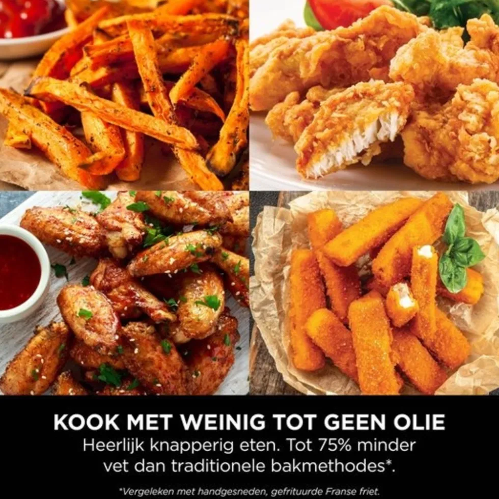 Inspiratie inbegrepen Begin direct met koken met een door een chef gecreëerd receptenboek inbegrepen in de doos, vol met recepten en kookkaarten voor al je heteluchtfriteuse favorieten.