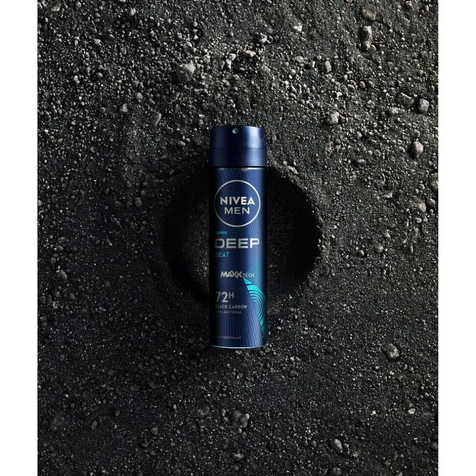Krijg 72 uur betrouwbare bescherming en een langdurige, frisse geur van houtachtige harmonie met de NIVEA Men Deep Black Carbon Beat Antitranspirant Spray.