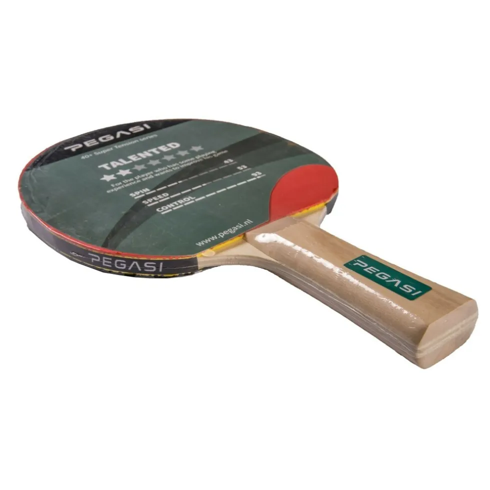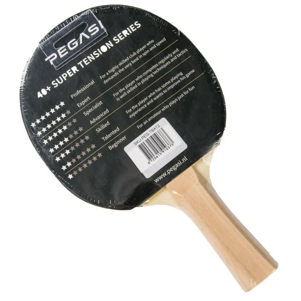 Dit tafeltennisbatje is geschikt voor hobby gebruik. Het Pegasi 2 ster pingpongbatje heeft een 1.6mm spons met glad rubber (rood-zwart). Het concave handvat ligt prettig in de hand en biedt goede grip. Deze bat scoort goed op de controle, voor een hobby speler wel zo prettig. Ook verkrijgbaar als batset, twee 2 ster tafeltennisbats en drie pingpongballen.