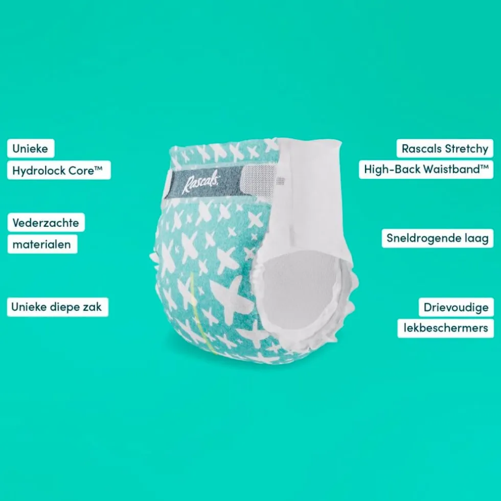 Rascal + Friends Maat 4 Premium Luiers zijn de beste luiers om viezigheid onder controle te houden. Ze zijn ontworpen met een aantal belangrijke innovaties wat minder lekken, minder viezigheid en minder stress betekent voor jou.