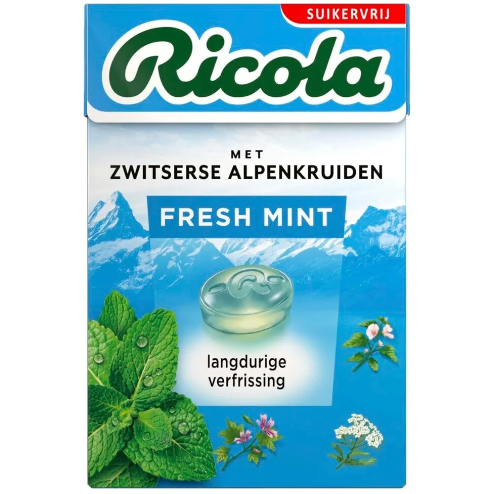 De suikervrije Ricola Fresh Mint Kruidenpastilles zijn een combinatie van dertien kruiden uit de Zwitserse Alpen met essentiële olie uit pepermunt voor een langdurig frisse muntsensatie.