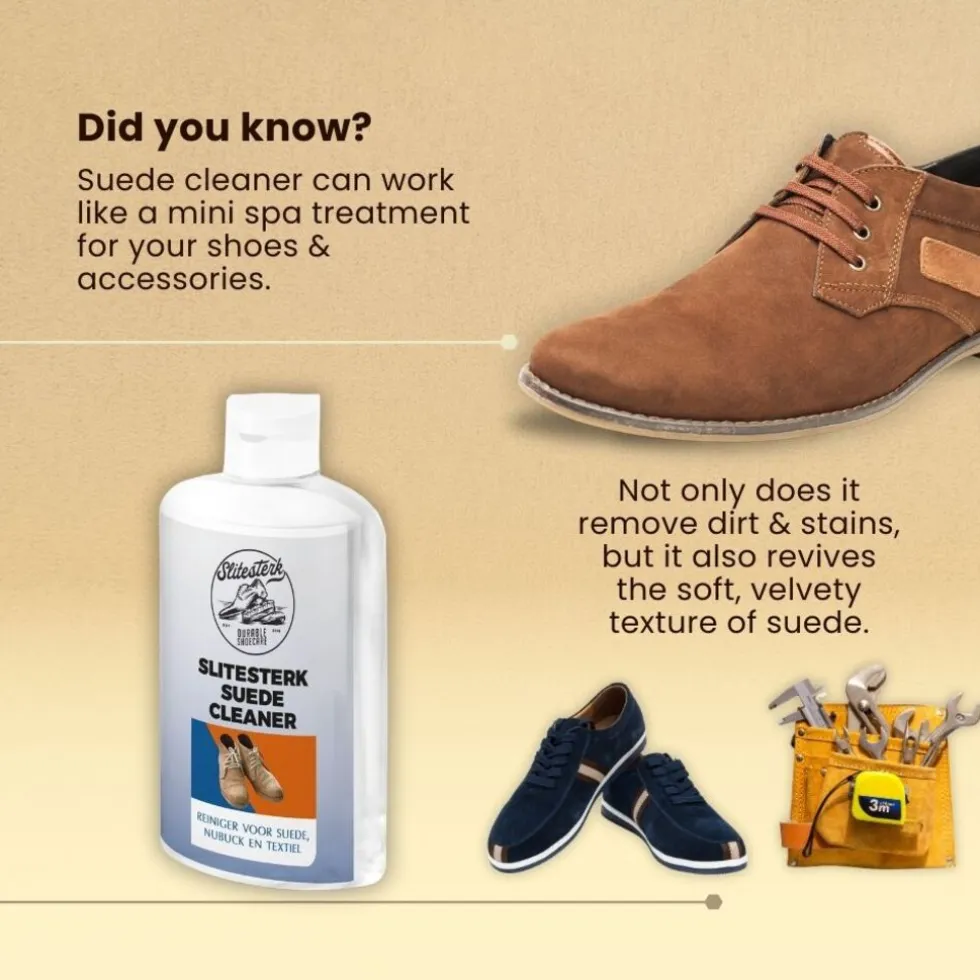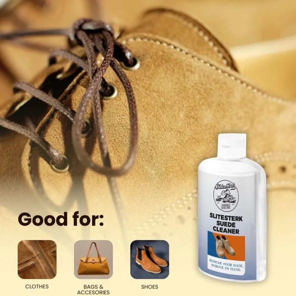 Vuile suede schoenen voorkom je niet. Omdat je vuile suede schoenen of laarzen niet voorkomt zul je af en toe even aan de bak moeten. Speciaal hiervoor is er Slitesterk Suede Reiniger. Een sterke oplossing waarmee je ook sterke vlekken mee weg kunt krijgen.