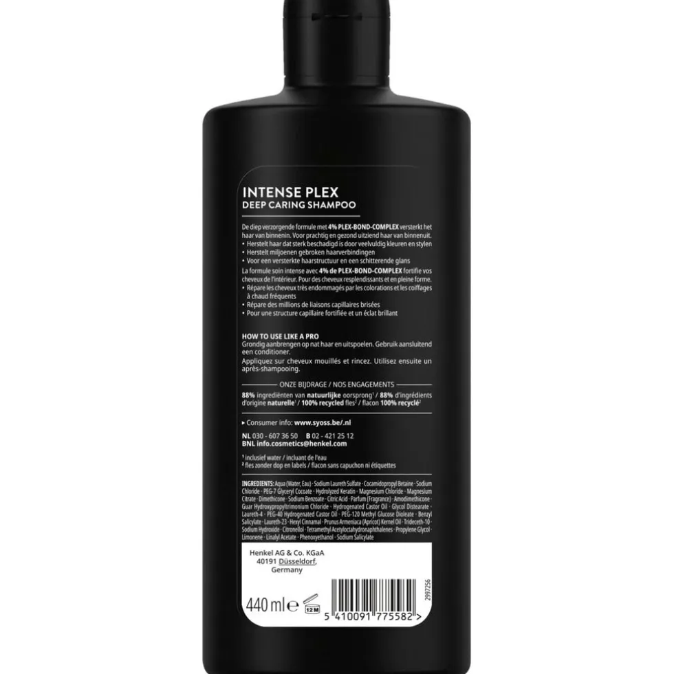 Syoss Intense Plex Bonding Deep Caring Shampoo herstelt haar dat sterk beschadigd is door veelvuldig kleuren en stylen. Het herstelt miljoenen gebroken haarverbindingen en geeft een schitterende glans.