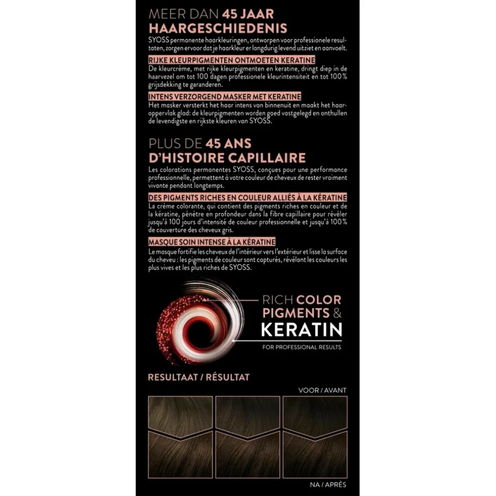 SYOSS permanente haarkleuringen, ontworpen voor professionele resultaten, zorgen ervoor dat je haarkleur er langdurig levend uitziet en aanvoelt. De kleurcrème, met rijke kleurpigmenten en keratine, dringt diep in de haarvezel om tot 100 dagen professionele kleurintensiteit en tot 100 % grijsdekking te garanderen. Het intens verzorgend masker met keratine versterkt het haar intens van binnenuit en maakt het haaroppervlak glad: de kleurpigmenten worden goed vastgelegd en onthullen de levendigste en rijkste kleuren van SYOSS.