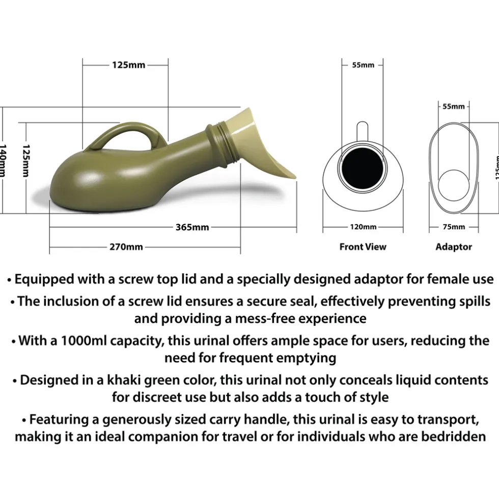 Dit unisex urinaal is geschikt voor zowel mannelijk als vrouwelijk gebruik. Dit urinaal kan als slaapkamer hulpmidel gebruikt worden maar is ook voor onderweg zeer geschikt. Het wordt geleverd met een adapter voor discreet vrouwelijk gebruik. Het urinoir heeft een ruime draagbeugel. Het is ideaal voor gebruik tijdens lange autoritten of als u bijvoorbeeld in de file komt te staan. Handig om in de slaapkamer te bewaren in huizen met een badkamer beneden of om de waardigheid van oudere familieleden die overnachten te helpen behouden. Hij heeft een inhoud van 1000 ml en is gemakkelijk schoon te maken en opnieuw te gebruiken. De kaki groene kleur verbergt de vloeibare inhoud tijdens het legen. Het schroefdeksel voorkomt lekken tijdens het vervoer van het urinaal.