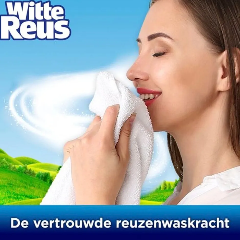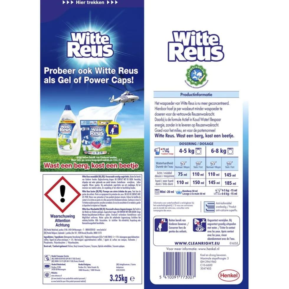 Witte Reus Waspoeder is geconcentreerd. Hierdoor hoef je per wasbeurt minder waspoeder te doseren voor de vertrouwde reuzenwaskracht. Daarbij is de formule actief in koud water.