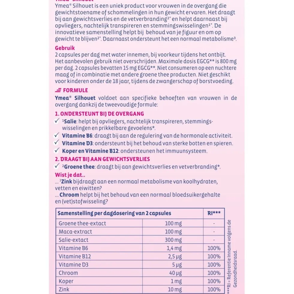 Ymea Silhouet is een fytoproduct. Dit betekent dat de hoofdingrediënten plantenextracten zijn die niet worden verdund.