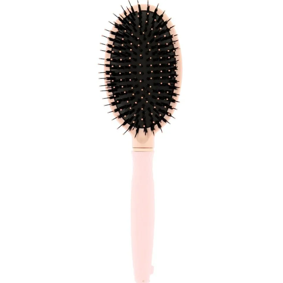 De nylonharen zijn zachter voor je haar en de omhulde nopjes zorgen voor een anti-statisch effect. Onderaan de borstel zit een uitklapbare punt, waarmee je strakke scheidingen maakt en je haar opdeelt.